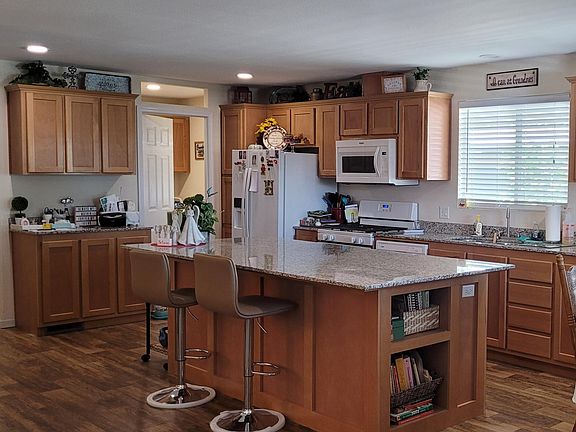 This manufactured home is only 5 years old! It is located in the very desirable Westwood Village Mobile Home Park in Porterville, a senior living mobile home park age 55 plus. Amenities at the park include club house, library, pool, pickle ball. This home is 1600 sq ft , with 2 full bedrooms and an office that could be a 3rd bedroom if so desired, from the office there is a slider leading outdoors. There is granite counter tops in the kitchen and bathrooms. The island is extra-large with granite counter tops and bookshelf on one end. The cabinets throughout the home are solid wood and made to last. As you enter it is open to the living room and kitchen and dining room with French doors leading to the office, and down the hall you will find the main bathroom and second bedroom and the master bedroom with large walk-in closet, large bathroom with double sinks and large easy step into shower. The laundry room also includes a large walk in pantry. There is a gazebo that will stay and a storage building. Call today!!!