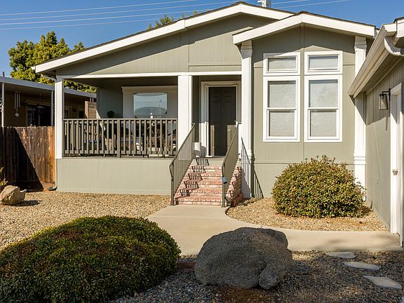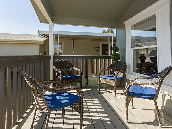 This upgraded triple wide may be the nicest home in the park, if not in all the parks. Open floor plan has deluxe kitchen w/ upgraded granite counter tops on kitchen counters, the kitchen island, the guest bath & hallway, with quartz in the master bath,& black granite in laundry. New stainless appliances, new complete paint & all new LVP (Luxury Vinyl Planking) floor coverings, new window coverings, electronic fireplace, new exterior paint, new roof in 2021, new water heater ,washer & dryer & A/C condenser replaced. Attached 2 car garage has a new walk in garage door, plus rear garage door to allow drive thru, which adds additional off street parking. The rear yard has a large covered rear patio. Low maintenance living indeed allows plenty of time to enjoy the front covered porch sitting. And all behind a security privacy gate, this beautiful park has a club house, pool & pickle ball court.