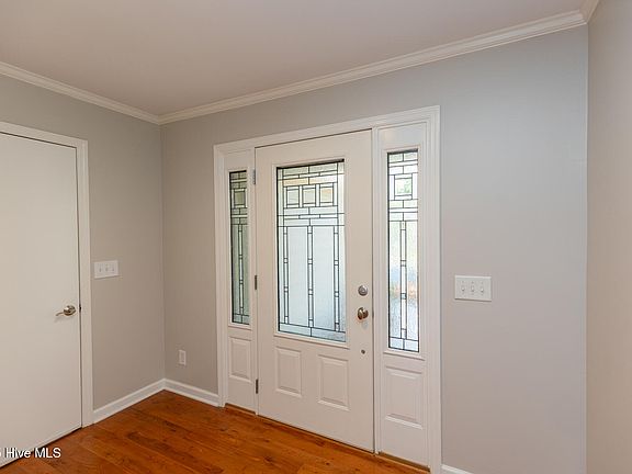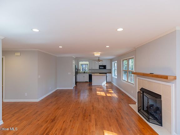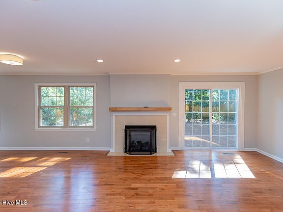Nestled on a gently sloping, wooded lot in a well-established Pinehurst neighborhood off Linden Road, this 3-bedroom, 2-bathroom home offers a warm welcome with its open floor plan and natural light-filled living spaces. Wood floors flow seamlessly through the foyer, living room, dining area, and kitchen, adding a touch of elegance. The spacious living room features a cozy ventless propane fireplace and sliding glass doors that open to a large backyard — perfect for relaxing. The kitchen includes a bay window overlooking the wooded yard, a small island with a breakfast bar, and ample cabinetry. The primary suite boasts double-door entry to an updated bathroom with a sleek quartz countertop, undermount sink, and a separate tub/shower area with white tile surround. Storage is no issue with three closets, including a walk-in. The guest bathroom features a stylish walk-in shower with decorative tile and clear glass enclosure. An extra-large laundry room provides abundant storage and workspace, and the 2-car garage comes equipped with its own heating and cooling. Conveniently located near the historic Village downtown and just minutes from shopping and dining, this move-in ready home combines comfort, character, and convenience.