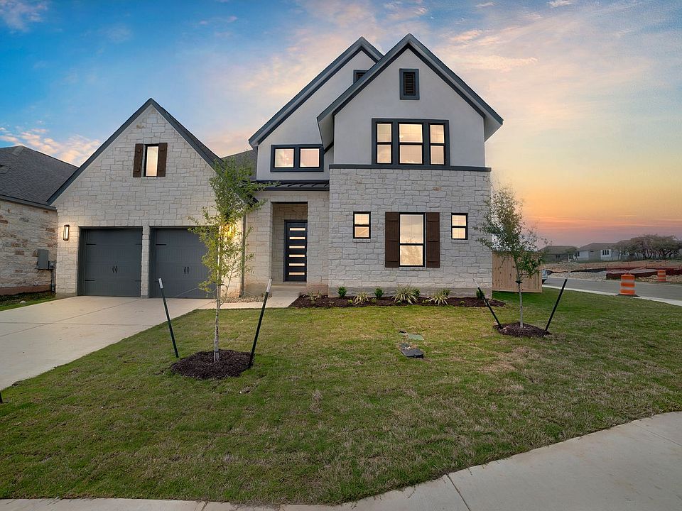 Impressive "Kennedy" home with modern high-end finishes, private guest suite with full bath on the main level, two-story family room with Western sliding glass doors, fireplace, study, flex room, a massive chef-inspired kitchen with extended island and a walk-in pantry.. Grand master suite with a luxurious spa bathroom including an elegant free standing tub and frameless mudset shower, spacious walk in closet with access to the laundry room. Upstairs features 2 generously sized secondary bedrooms, a loft, media room and game room. Includes 2.5 garage, gas stub, preplumb for water softener.