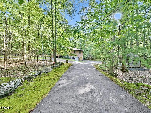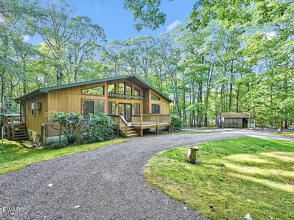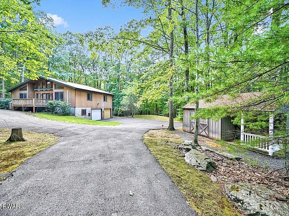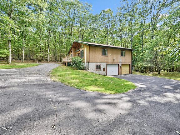 Located in White Sand Springs, one of the premier communities at Lake Wallenpaupack. The home is in private peaceful setting on over 2 acres which backs up to a greenspace and intermittent stream, great place to unwind and enjoy nature. Enter off the large front porch into the great room with its timber cathedral ceiling and lots of natural light, featuring a beautiful pellet stove on a stone hearth for added winter warmth. The 3 bed 2 bath home has an open floor plan, master bedroom and bath, walkout unfinished basement with a built-in workbench and two garage doors to park your cars, lake toys or finish it off for a family room. Drive your golf cart to the lake community lake access and boat dock. Conveniently located close to restaurants, shopping, and I84., Beds Description: Primary1st, Baths: 2 Bath Lev 1, Beds Description: 2+Bed1st