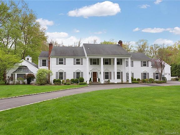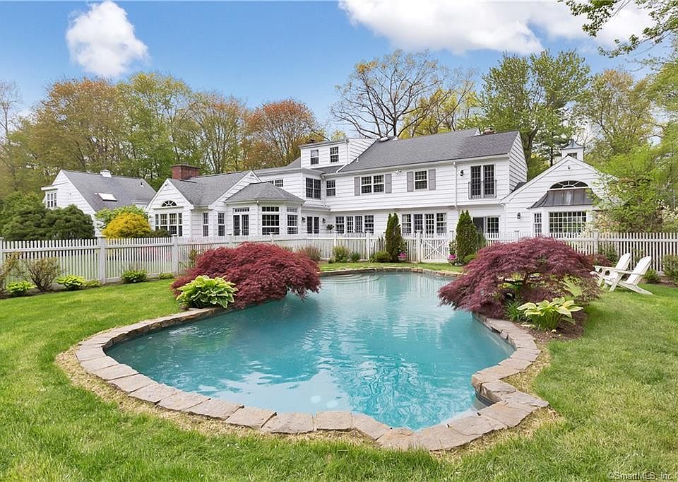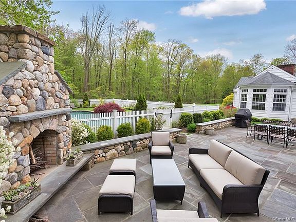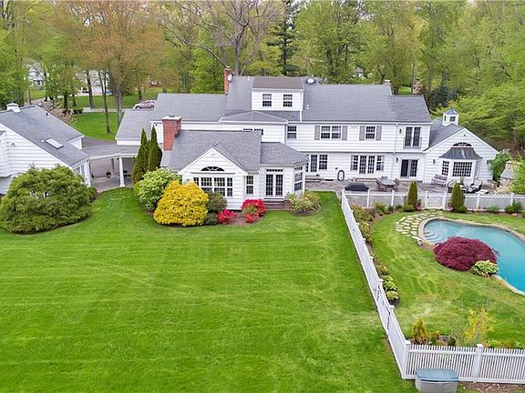 Beautiful Home for the Holidays! An entertainers delight with gorgeous pool in estate setting. Classic New England Colonial. Stunning white chef's kitchen with pantry, huge center island, breakfast bar, pot-filler, SubZero refrigerator and freezer, Wolf 6 burner cooktop and double wall oven. Sun-drenched Family Room with eat-in dining area, fireplace, built-ins and French door access to large blue-stone patio with fabulous outdoor fireplace. Recreation room off patio with full bath functions as a pool house, gym and party space. Elegant wet bar off den-office. Formal Dining Room opens onto back patio as well. Master suite includes 2 walk-in closets, office with fireplace, elegant bathroom with radiant heat, dual vanities and soaking tub. Spacious private office or guest suite with separate entrance above second 2-car garage. Plenty of space to work and play at home. Beautiful plantings and gardens surround pool. Large and private level back yard.