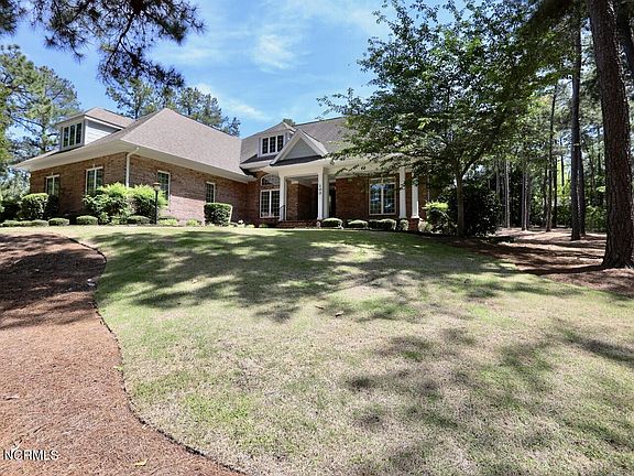 This custom-built, one owner, brick beauty is meticulous! Located in the desirable gated community of Pinewild Country Club. Just in time for the 2024 US OPEN, hosted by the Pinehurst County Club. Not one but two memberships available. Pinehurst Country club existing membership & Pinewild Country club existing Club membership available for transfer at the buyers expense. see documents . This single level split floor plan is great for entertaining. A spacious kitchen, tall wood cabinets, an expansive island, stainless appliances, all GE Profile, granite tops, tile backsplash, under cabinets lighting and a spacious breakfast area. Beautiful moldings throughout and 9' ceilings, except for the formal dining room with 12' ceiling. This home lives large. Lovely open living room with a double-sided fireplace between the light and bright Carolina room. Large primary bedroom with huge custom walk-in closet and sprawling bath. This split bedroom plan is perfect while entertaining guests. Both guest bedrooms with en-suite baths. Spacious utility room with built in ironing board, laundry sink built in cabinetry with folding counter & utility closet. 1/2 bath with beautiful pebble stone floors. A two-car garage with a golf cart garage and a large storage room. Great outdoor areas as well. Large covered front porch to greet your guest. a screened porch with sky lights and a composite deck. The propane has been piped to the gas grill. Great area in the rear of the home to relax and enjoy the outdoors. beautiful hardscapes surround the exterior. Lovely paver walkway from the driveway to the deck. Spacious driveway with blue stone and concrete curbing.