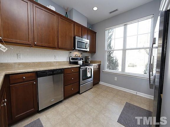 Move in ready townhouse in Southwest Durham. Nine foot ceilings down. Hardwoods in foyer, dining room and living room. Fireplace is nice focal point in living room. Lovely kitchen with stainless appliances, Maple cabinets and lots of counter space for prep work. Open plan so cook stays part of the party. Two graciously sized bedrooms upstairs each with ample closet space. Master at back w/ vaulted ceiling. Wide slat blinds through out. Come enjoy the walking trails, the convenience and lakes & wild life.