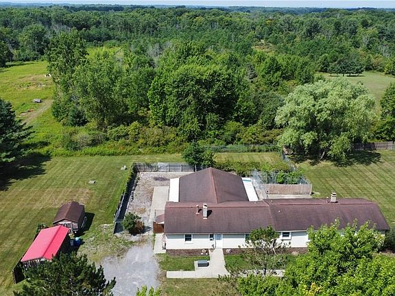A truly unique opportunity set on a beautiful 12.68 acre property! This Marano-built ranch, once a traditional 3-bedroom home, has been thoughtfully converted for use as an animal shelter, offering incredible potential for a variety of uses. The kennel features 16 stalls (8 per side) along with 7 fully fenced outdoor areas for dogs to roam. The office space includes a convenient dog wash, full bathroom, laundry hookups, utility room, and ample storage. The furnace is powered by gas but can also be run as wood-burning for added flexibility and savings. The original ranch layout included 3 bedrooms and a spacious living room, but was altered to fit the needs of the business. These generously sized rooms offer flexibility, with the potential to be reconfigured back into a spacious family room and an additional bedroom. Currently, the home offers 2 bedrooms plus an additional room perfect for storage, an office, or hobby space. The second bedroom offers direct access to the large concrete patio in the backyard, perfect for enjoying warm nights and entertaining guests. A dry basement with a sump pump provides peace of mind and confidence in the homes foundation. This property also includes a huge gravel driveway with ample parking space for guests, equipment, or recreational vehicles and two sheds for even more storage. Whether you envision continuing its use as an animal-focused facility, reconfiguring it back into a single-family home, or exploring other creative possibilities, this property is ready to fit your vision. Also listed as Commerical Property B1632042. 2025-08-27