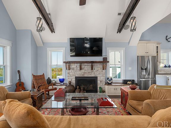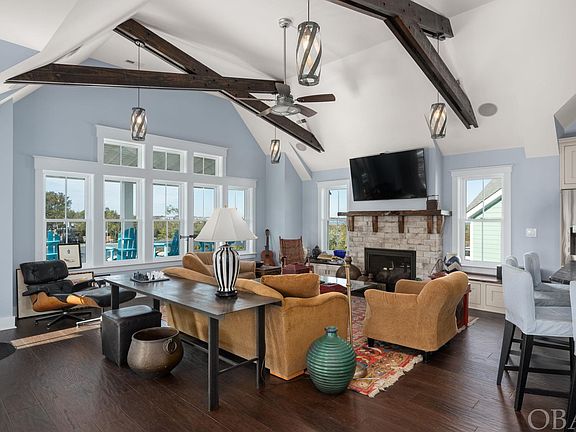 100 Sunset Ct. is the epitome of all things Coastal! The location is certainly coastal, as it’s located in the small waterfront community of the Peninsula in Manteo, NC. There’s 140ft. of deep-water bulkheaded canal available at your back door to dock your boat/boats/jet skis/ pontoon or kayaks! The bulkheaded walkway encircles the community and offers access to the navigable Shallowbag Bay channel connecting the Roanoke Sound and Pamlico Sound through the Oregon Inlet to the Atlantic Ocean. The home was designed by Michael York of The Coastal Cottage Co. Sitting atop a high lot, there are terrific views of the canal, the sound and marsh so that morning, noon and sunset time, you’re surrounded by brilliant blues of sky and water or cloud colors indicative of the boating weather for the next day. This home has immediate curb appeal from the driveway pavers to the cottage architecture. A beautiful custom front door and sidelights allow light into the welcoming foyer providing privacy and light to the mid-level where you’ll find Eddie Bauer engineered hardwood floors, coastal trim and details all round. In the hallway, there’s an elevator, closet and laundry with washer/ dryer and an extra freezer for your “catch of the day”.This functional space is neatly disguised by sliding barn door for easy access. There are 3 bedrooms on this level, all with balcony/deck access. There’s a primary bedroom on the north west with a generous closet and large, private bath. The double vanity with the glass vessel sinks is flanked on one end with a private water closet on one side and a large walk-in tiled shower with transom window, built in seating and shower heads on the other. A linen closet completes the picture. There are two other bedrooms on this level which are connected by a Jack and Jill bath with 2 separate/private vanities with vessel sinks, bench seating as well as separate closets for each. The linen closet holds everything you need for enjoying the large walk-in tiled shower with a transom window. The two bedrooms on the north side have canal views and the bedroom on the south looks out across the community to the sound beyond . Take the elevator up to an open concept top floor with vaulted ceilings and hand crafted beams. The spacious kitchen has room for more than one cook or separate prep areas with more cabinet spaces than you could ask for. The 48”gas cook top with pot filler, double electric oven, dishwasher, wine cooler are all connected by leathered granite countertop and has ample seating all round for those who like to watch the cook and get first dibs on the feast. The light fixtures in this area are made from Handcrafted California wine barrel rings. Gather around the gas fireplace with a live edged mantle central to the seating area and a generous separate dining area adjacent to the one of the best butler’s pantries you’ve seen in a while. There’s room for a slim extra fridge and it’s all accessed by a sliding barn door. Step out to an open west facing deck where you can see the sound and Jockey’s Ridge to the east or sunsets to the west. There’s also another bedroom on this level which is currently used as an office/sleeping area. The full bath with tile shower makes it a very comfortable, accessible spot. Take the elevator/stairs down to the ground level with luxury plank floors which is great when you’re coming into the house from a swim or grilling on the spacious pool deck. The large salt water pool is really the icing on the cake! It’s surrounded by a generous pool deck large enough for several lounge chairs and the beautiful jasmine covered trellis. Access to the canal is easy via 3 fence gates so you easily jump on the boat, come back for a swim and soak in the 7-person hot tub or grab a refreshing beverage for a game of pool. Coffered ceilings in shades of blue make this more than your average game room/den and wet bar area.