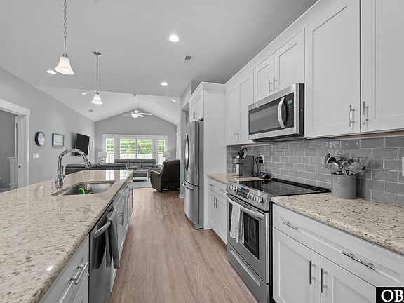 As you step inside, the open-concept floor plan welcomes you with an airy, spacious atmosphere. The heart of the home, a stunning kitchen, features a large island perfect for casual dining or entertaining, alongside barn doors that lead to a versatile office or third bedroom. Upgraded stainless steel appliances-including a premium stove, oven, refrigerator, washer, dryer, and dishwasher-add a touch of luxury and convenience to your daily routine. Plantation blinds adorn every window, and the inclusion of a portable generator with a manual transfer switch ensures you're prepared for any unexpected power outages. Unlike newer homes in the community with vinyl siding, this home is built with durable, low-maintenance composition smart siding. Additionally, oversized rain gutters and a crisp white vinyl fence add to the exterior appeal. The furniture in the Great Room and Dining Room is negotiable, and all TV's included-offering a move-in-ready experience. Situated just 15 minutes from the Outer Banks and close to shopping and conveniences, this home's location is unmatched. The community amenities truly set this property apart, featuring a clubhouse, large swimming pool, grill room, soundfront marina with boat slips, a fishing pier, and a scenic pavilion. Recreational options abound with tennis and basketball courts just steps away. Whether you're looking for relaxation or recreation, this home offers it all with exceptional value and modern charm.