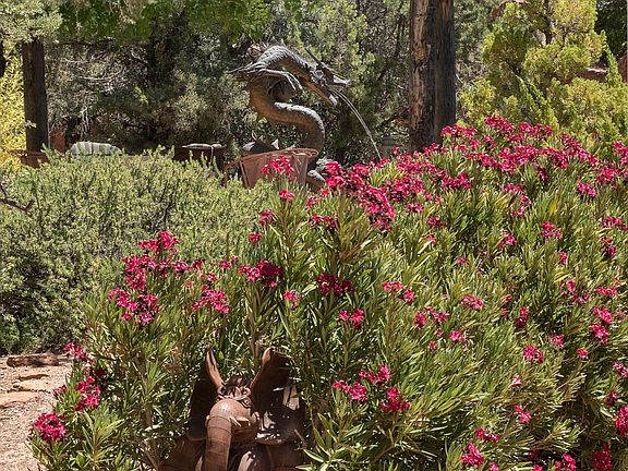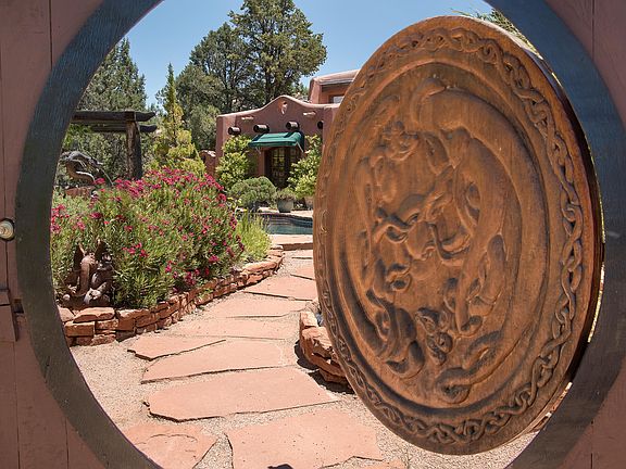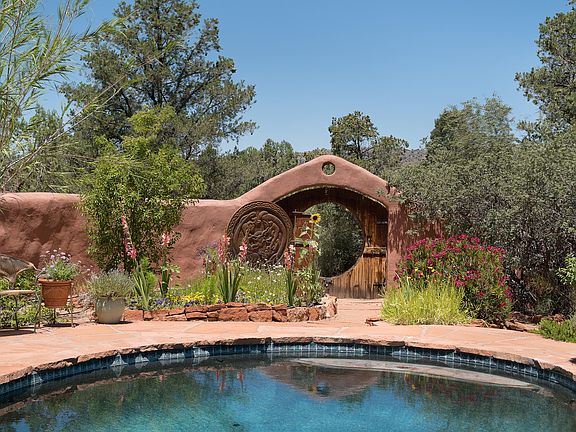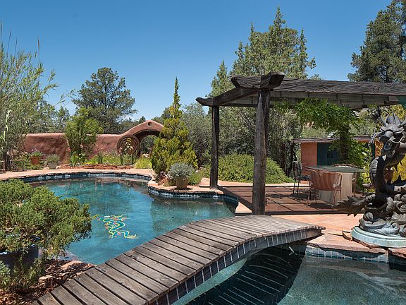 World renowned Power Feng-Shui artist and author created this home as their personal retreat and called it the ''Dragon Farm'', an inspired adobe and red rock home rarely seen on the market in a supremely private setting. Featured in the Sedona Style book ''Desert Retreats'' by Linda L Paul. As part of the original Helen Vanderbilt-Frye Estate, previous owners were drawn to this pristine ancient land seeking peace and solitude to explore the deeper flows of life and play. 2000 sf residence, studio/guest house of 770 sf on 2.98 acres, flower gardens and 26 fruit trees. Pool added in 1999 with water feature. New metal roof in 2012, passive solar design. Saltillo tile throughout. Borders wilderness area, views of Cathedral Rock. An oasis in the desert offering extraordinary privacy.