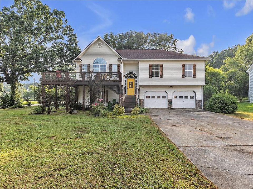 Fresh Price Reduction! Seller is Motivated! Welcome to this spacious and inviting home offering an abundance of living space, both indoors and out. The charming exterior features a welcoming front porch, a distinctive yellow front door, and a large elevated deck perfect for entertaining or relaxing. Step inside to find vaulted ceilings in the living room, highlighted by a dramatic arched window that fills the space with natural light. The open-concept kitchen is equipped with stainless steel appliances, abundant cabinetry, and a stylish tile backsplash. A dedicated dining area flows seamlessly to the deck, creating an ideal setup for gatherings. The main level hosts three comfortable bedrooms, including a primary suite with a walk-in closet, a double vanity, a relaxing soaking tub, and a separate shower. Two additional bedrooms and a full hall bath complete the upstairs layout. Downstairs, you'll find a half bath and two additional bedrooms (not pictured), providing flexible options for guests, an office, music room, or a home gym. The oversized two-car garage offers plenty of storage and workshop potential. Enjoy outdoor living on the expansive wraparound deck overlooking the yard with mature trees and space for gardening or play. The HVAC is brand new! This home combines the feel of peaceful country living with the convenience of an established neighborhood close to town amenities.