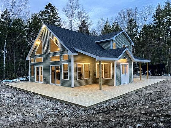 Welcome to 100 Twin Springs Lane on Center Pond! Boasting 2.1 acres and 295 feet of privately owned water frontage; this stunning new construction Chalet built in 2023 features a wrap around covered porch, panoramic views of the lake, cathedral ceilings, granite countertops and an open- concept living area perfect for entertaining. Tastefully designed by the builder with the lake life in mind! The first floor consists of an open living room, dining room, and kitchen, as well as the primary suite with a full bath, half bath and a 2nd bedroom. Plenty of closets for storage as well! Take in the amazing views of the lake from the second floor consisting of two bedrooms and a full bath. You'll never have to worry about the power going out with the on-demand standby generator. Currently the road is being maintained year round by private residences. This property offers plenty of space and privacy with no neighbors in sight, yet conveniently located only minutes from downtown Lincoln. Lincoln is a full service town with all the amenities one would need. Center Pond is a warm water lake with approximately 192 acres of boatable waters. Kayak, canoe, power boat or jet ski. Direct access to the snowmobile trails system. ATV trails are close by.