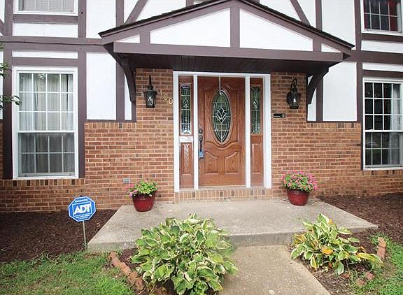 Wonderful Tudor-style 4 bedroom, 3 bath Two-Story w/ side load garage & wood fenced backyard on corner lot in Wolf Branch Schools! Concrete walkway leads to home w/ upgraded wood front door. Upon entry into foyer, open concept spacious living room / family room to right w/ front window & family room w/ beamed ceiling, white painted wood burning fireplace, wet bar w/ granite counter & sliding glass door to backyard patio. Other side of foyer sits dining room w/ tiled floors & window to front. Through foyer is large eat-in kitchen w/ warm brown oak cabinets, granite counter tops, designer back splash, planning area, double door pantry & stainless appliances & electric range. Spacious laundry w/ tub sink off kitchen leads to two car garage w/ pull down stairs to attic. Half bath on main. Rod iron balustered staircase to second floor w/ master bedroom suite w/ upgraded 4'' x 3'' walk-in shower & large WIC & three additional bedrooms & full bath. Newer windows, flooring & painted exterior!