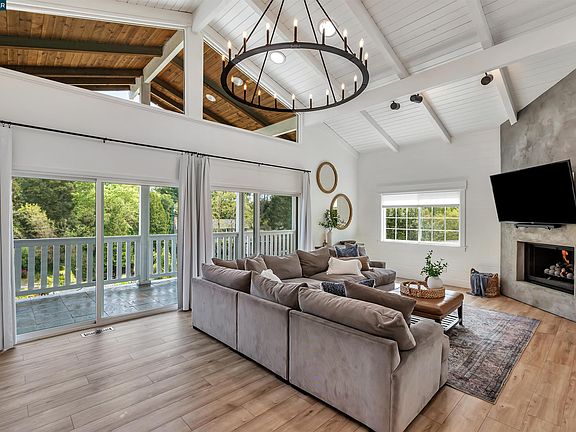 Nestled in the heart of Alamo, 100 Valley Oaks Drive is a stunningly remodeled 5-bedroom, 3.5-bathroom home offering 2,686 sq. ft. of luxurious living on a sprawling .6-acre lot. Designer touches grace every corner, from the soaring wood-paneled ceilings and cozy fireplace in the living room to the custom built-ins and dazzling chandelier in the family room. The dream kitchen boasts two-tone cabinetry, a waterfall island with breakfast bar seating, white shaker cabinets, a 6-burner gas range, stainless steel appliances, and designer pendant lighting. The oversized primary suite features its own fireplace, a private balcony, and a spa-like ensuite with a dual vanity, shower stall, and massive walk-in closet. Hardwood floors, wainscoting, recessed lighting, and elegant baseboards enhance the home’s modern charm. The backyard is a true private oasis, featuring an expansive deck, lush lawn, and sparkling pool with cascading waterfalls. A relaxing hot tub, outdoor kitchen under a charming pergola, and a professional-grade putting green create an entertainer’s dream. A batting cage adds even more versatility to this resort-like retreat. Located near top-rated schools and Roundhill Country Club, this home offers an unparalleled blend of luxury, serenity, and convenience.