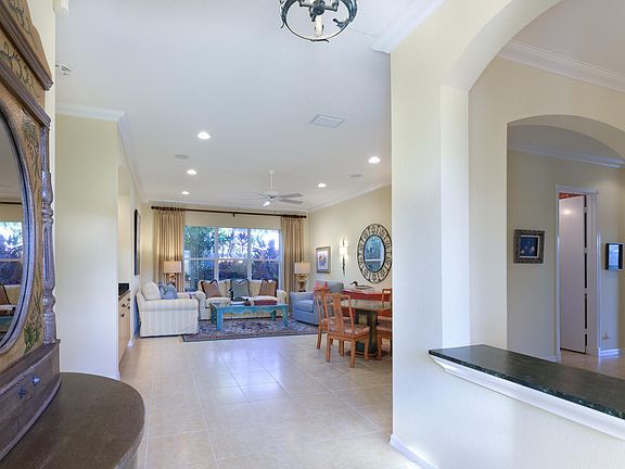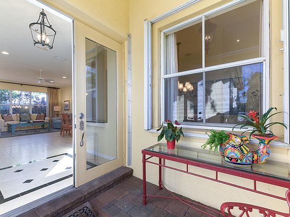 Discover this remarkable lakefront, one level home offering nearly 2600 ft.² of living space! The distinctive extended Granada model presents three bedrooms along with a spacious den/office that could be converted to a 4th bedroom, all complimented by the unique positioning of this property which's is adjacent to an empty lot, easement never to be built on! Picture yourself in the updated kitchen, with Franke sink and grate, newer refrigerator, dishwasher, five burner gas cooktop, instant hot water system, quartz countertops and custom pull outs in all cabinetry. Enjoy the expanded patio fully enclosed in hurricane grade screening, equipped with gas hook up for outdoor grilling, ideal for entertaining or relaxing while overlooking spectacular water views. Unwind in your spacious primary suite overlooking the water featuring walk-in closets and en suite bath with soaking tub, separate walk-in shower and dual sink vanity. Guests enjoy separate living area with two large sized bedrooms. The office area offers flexibility able to be converted into a fourth bedroom or remain functional with well-designed built in workspace. Additional highlights of this home include crown molding, built in bar with custom cabinetry, enhanced lighting with additional high hats throughout, hardwired speaker system in main entertaining areas inside and out, accordion shutters, new carpet in all bedrooms (2022) separate laundry room and a two car garage. Mirabella is a gated community with resort style amenities, no membership requirements, zoned for A-rated schools.