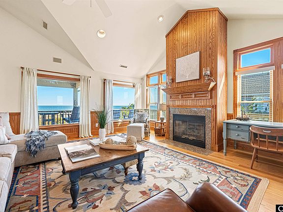 The spacious living room, featuring a cozy fireplace and expansive windows, creates an inviting atmosphere while framing stunning ocean views. It flows seamlessly into a modern, updated kitchen that offers abundant countertop and cabinet space, as well as an L-shaped island with generous seating for family gatherings and entertaining. Adjacent to the kitchen, the dining area is bathed in natural light from large windows facing the ocean, and the living area offers easy access to a spacious wraparound deck that overlooks the beach—a serene spot to catch the ocean air.