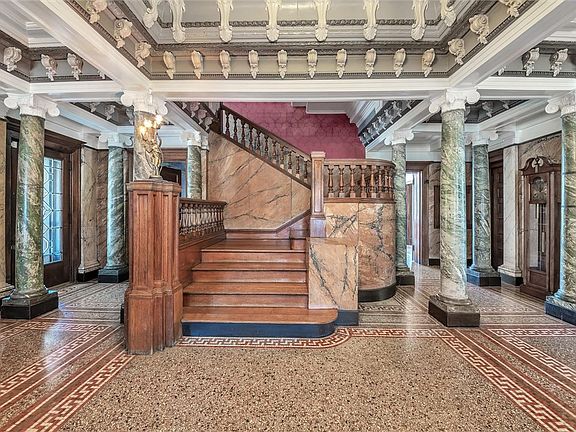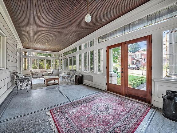 enclosed sunroom, jaw-dropping marble entrance foyer, light-filled formal living room, floor to ceiling quarter-saw oak dining