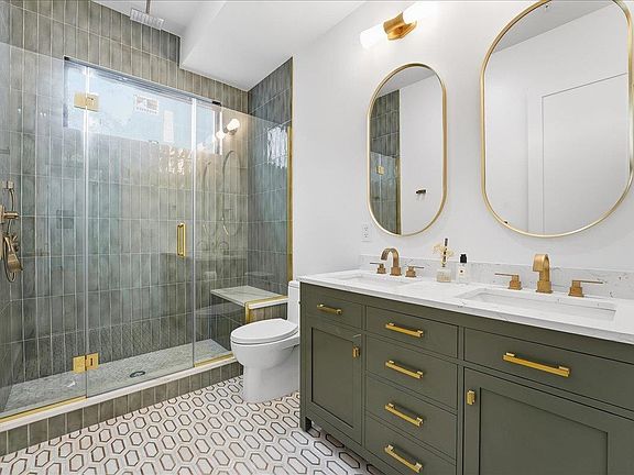 The primary ensuite bathroom is a luxurious retreat with elegant gold accents, and a glass-enclosed shower with a multi-spray system and rain head. Additional features include ample closet space & brand-new washer and dryer.