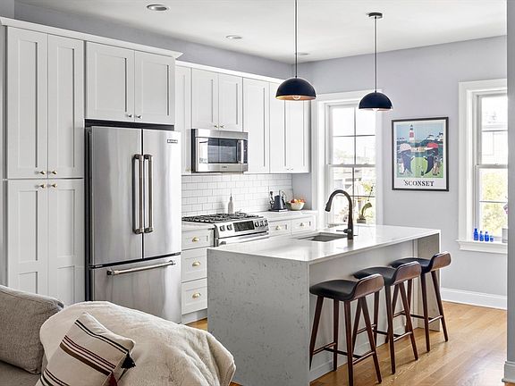 Highly desirable 2bd/2ba home with enormous private roof deck offering stellar harbor and Boston skyline views! This recently renovated 1100 sqft penthouse condominium w/ 9ft ceilings boasts an amazing open concept floor plan and custom louvered interior window shutters throughout. The kitchen features Bosch kitchen appliances, quartz counter tops and large island with seating for 4. Dedicated dining area and large living room area that can easily accommodate a sectional sofa. The spacious primary suite features custom closets and spa-like bathroom with soaker tub. The second bedroom easily fits a queen sized bed or functions as a home office/workout space. Enjoy hosting summertime parties from your amazing roof deck w/ custom built-in seating. Additionally, there is a shared manicured backyard. Walk to local restaurants such as The Quiet Few, The Tall Ship, and MIDA! Only a 5 min walk to both Maverick Sq T and the water ferry with direct connections to both the Seaport or Long Wharf.