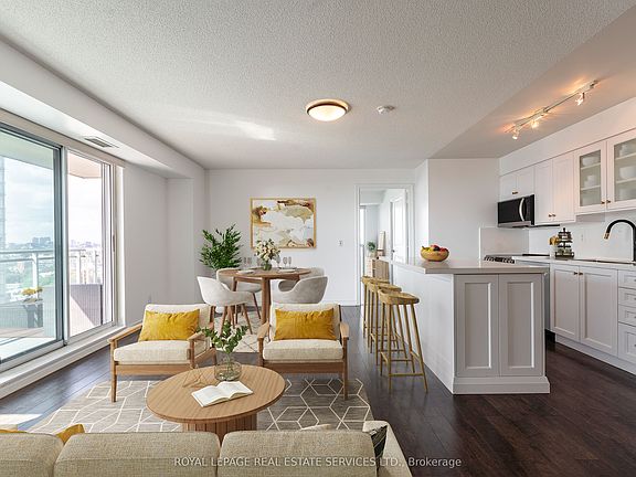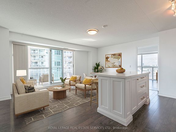 Welcome to Vibe at Liberty Village! This beautifully renovated 2-bedroom, 2-bath condo combines style, functionality, and comfort in one of Toronto's most vibrant neighbourhoods. The desirable split-bedroom layout is filled with natural light from floor-to-ceiling windows and anchored by a modern open-concept kitchen with stone counters, stainless steel appliances (LG ThinQ oven + microwave, Frigidaire Gallery fridge, LG dishwasher), breakfast bar island with hidden storage, and double undermount sink with designer faucet. The primary suite offers a spa-inspired 3-piece ensuite with mosaic tile flooring, glass shower, stone vanity, black fixtures, Kohler toilet, and custom closet built-ins with wallpaper accents. The second bedroom also features a large closet with organizers and wallpaper detail, with easy access to the upgraded 4-piece bath complete with modern vanity, stone counters, and Kohler fixtures. Additional highlights include Bosch front-load washer/dryer, dual Honeywell thermostats (living room + primary), abundant closet storage, and quality finishes throughout. Step out onto your extra-large private balcony with lake and sunset views. Includes one owned locker (Level B) and a prime end parking space (#449, with no neighbour on one side). Residents enjoy exceptional amenities across three interconnected buildings: concierge, fitness centre, pool, sauna, rooftop terrace, party/media rooms, guest suites, dog park, billiards, visitor parking, and more. All this just steps to cafés, shops, Metro, LCBO, TTC/GO Transit, BMO Field, waterfront trails, and King West. A turnkey, move-in ready home in the heart of Liberty Village! Some images may be virtually staged.