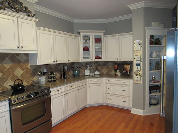 - KITCHEN DESC: Pantry, Crown Mold, Smooth Ceiling, Wood Floor, 9? Ceiling, Sol Sur Cntrtop, Built Ins