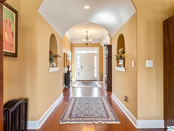 Stunning like new move in ready brick home situated on a cul-de-sac street located minutes to Redstone Arsenal. Spacious manicured & privacy fenced yard w/ covered patio & outdoor living space. Gorgeous interior loaded w/ detailed crown molding, trim work, & hardwood flooring. Lots of natural light w/transom windows. Foyer w/arched opening leading to the Family Room. Living Room can be a study or 5th bedroom. High smooth ceilings throughout. 3 car side entry garage w/storage above. Brick landscape borders. Community pool, tennis, & playground.