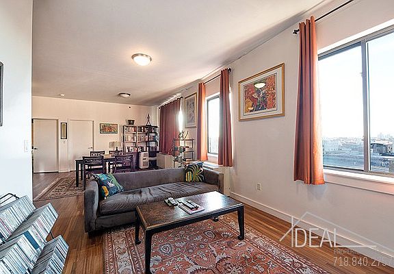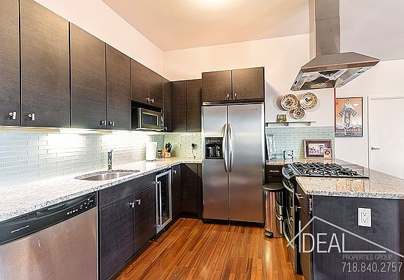 This is the penthouse of your dreams! Walking in to this 5th floor, 1,300 square foot condo you are greeted by breathtaking, panoramic views of Manhattans skyline.The nearly eleven foot ceilings and pristine Brazilian Cherry-wood floors allow the three sets of large windows to flood this condo with natural light. The east side of the very expansive living space can turn into a sizable third bedroom with the addition of only one wall.The kitchen boasts granite counter-tops, a breakfast bar and brand new stainless steel appliances throughout. With a five-burner gas range, an operational hood vent, dishwasher, an enormous refrigerator in addition to a wine fridge, this is truly a chefs dream.Both bedrooms can accommodate king size beds plus furniture and have full sized double closets. The master bedroom has an en-suite full bath and both are attached to the South West facing, private corner-balcony. And if the balcony isnt enough there is a deeded rooftop space allocated just for your unit. With area zoning preventing any new construction projects from rising higher than five stories the views will stay there as long as you do. The building itself is equipped with a new full gym, parking garage (with Electric Vehicle charging stations), laundry and deeded storage. All of this only one block from the Dekalb L stop in one of the fifteen coolest neighborhoods in the world, as per Vouge Magazine review in their September 2014 issue. Bushwick, colloquially known as the, Street Art capital of the world, has entire blocks lined with colorful murals commissioned by local artists. With nearly 60 galleries, loads of independent coffee shops, trendy bars and restaurants Bushwick is a cultural hot bed of activity. Never a dull moment, living here will instantly put you in the know and submerse you in what is quickly becoming one of the most sought after areas of Brooklyn. RSVP today for the upcoming open house or for a private viewing!