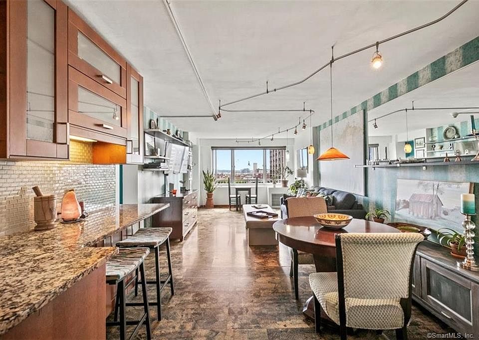A unique NY style 1 bedroom co-op perfect for city living full or part time. This unit has been beautifully renovated with a lovely kitchen with granite counters, glass backsplash, and maximized use of space. A lovely breakfast bar and additional storage in the dining area. Custom lighting in the dining/living room with amazing varying fixtures. The unit features cork flooring, good for the back and helps reduce noise. There is plenty of closet space with a walk in at the entrance, and custom closets in the bedroom. Lots of custom shelving that can come with or be removed. Wonderful city views looking east for enjoying sun and moon rises! A wonderful balcony, perfect for sitting and suited nicely for plants. The monthly fee includes heat, hot water, property taxes, and has been approx. 40% tax deductible in the past. University Towers features 24 hour security, elevators, remodeled laundry facilities, on-site property management, pool, and more! Non-smoking building. Walk out your door to New Haven's finest restaurants, museums, theater, and shopping. No dogs. No investors. Cash only.