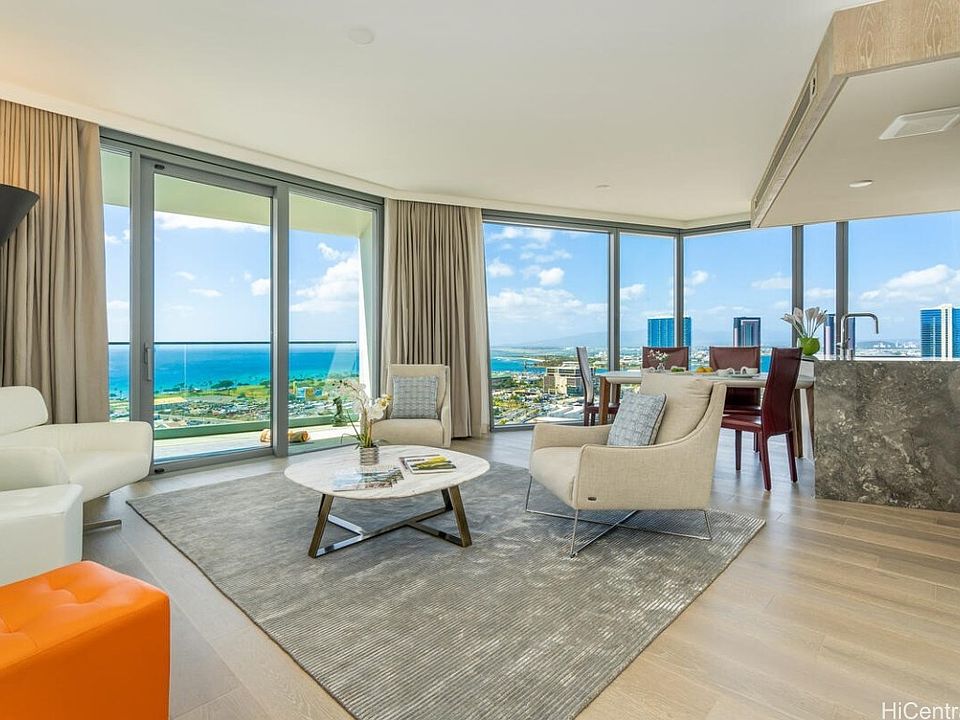 If you are looking for the best one-bedroom unit in Koula, look no further than this customized oceanfront corner residence! This 1 bedroom, 1 bathroom unit has been efficiently designed to maximize space, creating a cozy experience. Features direct ocean views of Kewalo Basin Yacht Harbor, which will be mostly preserved, even with future construction. Enjoy abundant natural light throughout the residence, and savor the unique beauty of living in Hawaii. Includes over $37k in upgrades, including wood flooring throughout, Neorest Toto toilet, and electric blackout and sheet curtains.
