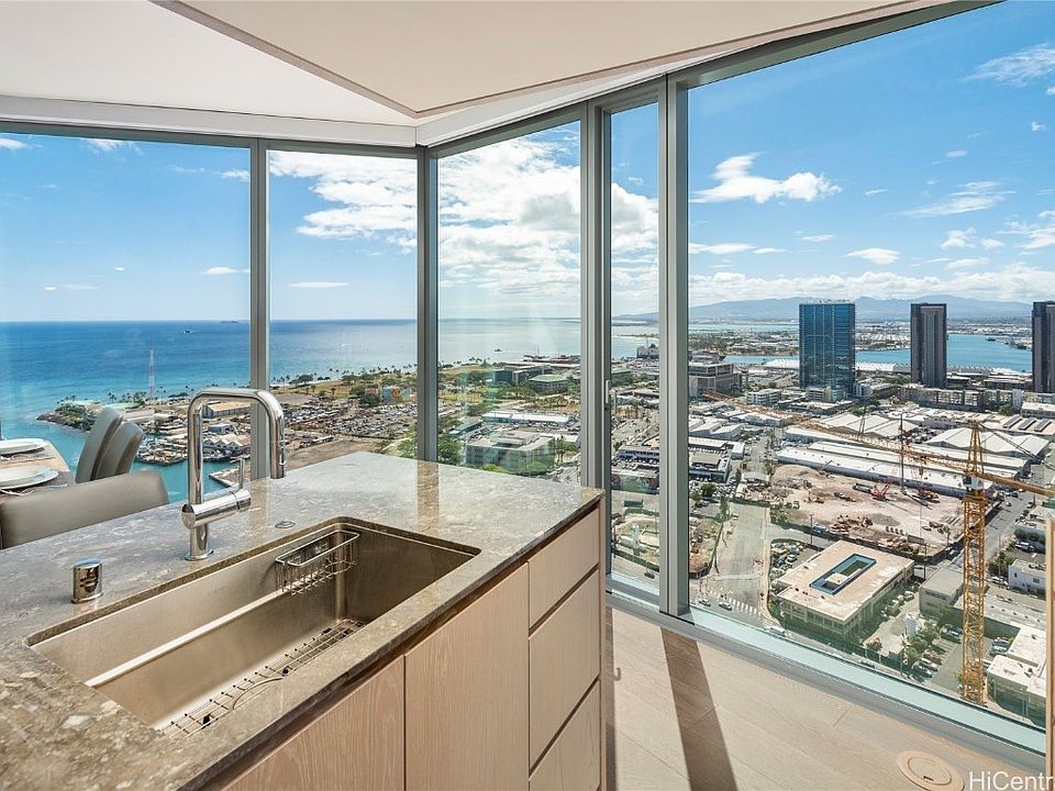 Introducing a brand new luxury building, a Sancturay by the Sea. This exquisite high floor corner end unit offers unparalleled views harbor and sunsets. Includes one covered parking space with option to add an EV Charging station. Archtected by renowned Jeanne Chang, building comprises of 565 unis embodying elegance and sophistication. Featuring central AC, floor to ceiling windows illuminating the space and engineered wood flooring. The open kitchen is equipped with Miele Kitchen appliances complemented by an impressive 8.8 foot ceiling height. This pet friendly residence allows for 2 pets under 60 pounds. Additional perks include guest suites available for $250 a night. The resort style amentities on the 8th floor include pool, BBQ area, excerise room, sauna, whirlpool, grand lanai, dog park, dog bath, putting for golf, playground, rec room, security guard, manager, fire sprinklers and concierge. Six elevators plus 2 service, building has surboard and Bike storage. Located within walking distance to Whole foods, coffee shops, salon, Ala Moana beach park, and culinary delights. Exceptional higher end furniture, pots, pans, linens. Just Move right in.