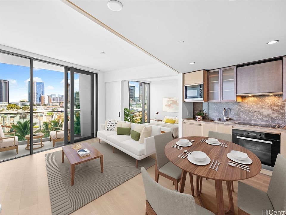 This one bedroom, one bathroom tower residence features an 8'10" ceiling height, with an open concept floorplan and a sliding door between the living room and bedroom adds flexibility when showcasing the living space. Enjoy the wonderful tree-top, Victoria Ward Park and the Kewalo Basin Harbor/ocean views through the floor-to ceiling glass windows and private lanai. Miele appliances, custom wood cabinets, natural stone counter tops, and wood flooring throughout (except in the bathroom). A bountiful amount of amenities include a 25-yard lap pool, 2 oversized spas, large entertainment room and lanai, sunset bar and lounge, fitness center with treatment room, outdoor dining and barbecue pavilions, private dining room, chef's and catering kitchens, children's play area and much more! Located in the award-winning master planned Ward Village community with lots of shops, restaurants and entertainment nearby; in close proximity to Ala Moana Shopping Center and Ala Moana Beach Park. Koula is truly an amazing place to see and live at.