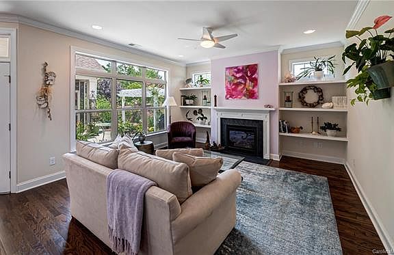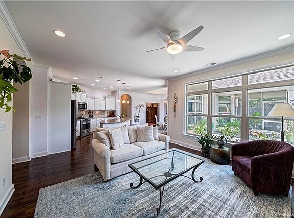 Enjoy the all the convenience of an active 55+ community in your beautifully appointed, open floor plan 1 1/2 story home! 2 spacious bedrooms and two walk-in baths on the main floor and 1 BR/1 BA w/bonus on the second floor. Perfect for visiting friends and family. Gourmet kitchen with SS appliances and quartz counter and island with bar seating. Open great room with gas log fireplace looks out on the patio and flowering landscape with pergola. Owner's suite has tray ceiling and access to serene screened porch with a view of the pond and fountain with night lighting! Home Buyer's 2-10 1 yr warranty is provided!