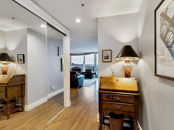 Executive Waterfront 2 Bed/2 Bath Residence in the Heart of Beach District! This perfectly appointed corner suite has been substantially remodeled & boasts panoramic 180 degree southwest water views! Spacious Kitchen w/ custom maple cabinets, Corian counters, Italian stone tile, Subzero & Fisher Paykel appliances. Generous Living/Dining areas w/ elegant maple hardwood floor; accented w/ floor-to-ceiling windows & a cozy fireplace. Primary Bedroom features Tuscan style ensuite w/ soaker tub, shower stall & marble counters. 2nd Bedroom w/ built-in Murphy bed & Home Office. Enjoy year round sun on the BBQ Balcony & appreciate forever sunset views. Amenities: 24hr Security, Concierge Services, 7,000 sf Health Club, Pool/Hot-tub/Sauna/Gym. 2 Parking + 1 Storage. Open House: Sun, Oct 31st, 1-4pm