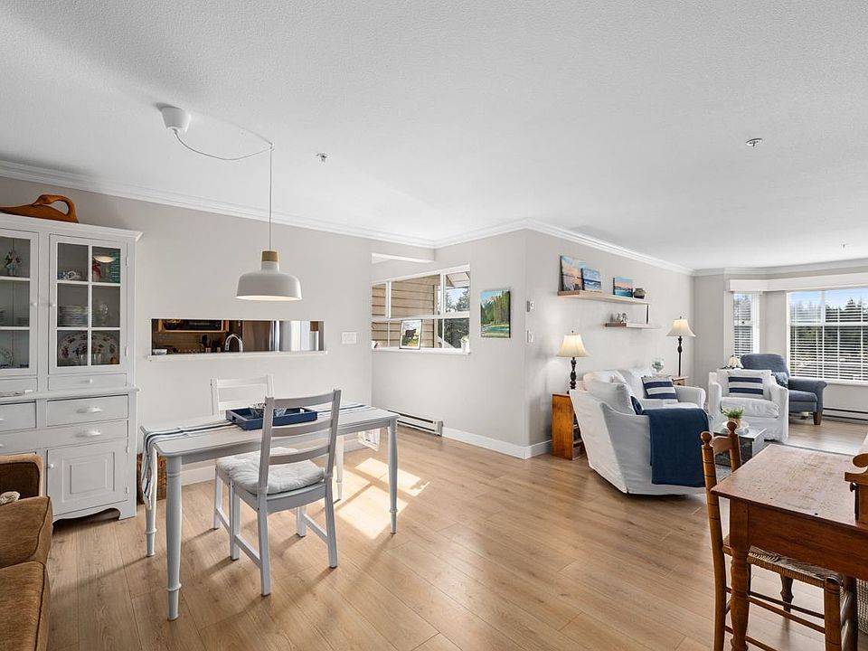 Downsizers Dream! Space, Privacy, Light, Views. This one-bedroom Penthouse is perched at the top of the building looking out over the tree-tops with south and southwest-facing views. The space is light-infused with the flexibility to open up the kitchen or to add a den. Exterior walkways are great for those with pets or bikes. Generous rooms across 1016 SF make this a unique find. Topped off with crown moldings, laminate floors & 2023 bathroom reno, this quiet, well-run, and friendly building is steps to shopping at Parkgate Village. It is an outdoor enthusiasts dream location: shopping, hiking, biking, boating, swimming, tennis, pickleball, community gardens and more all within minutes of your front door. 2 parking-one w/EV charger already installed! Bike room too.
