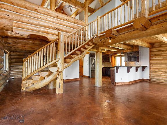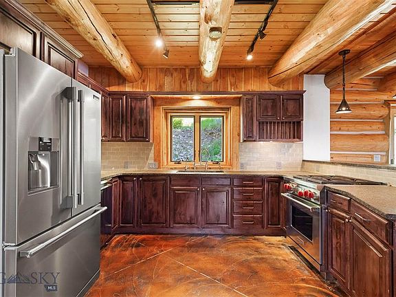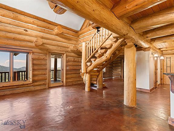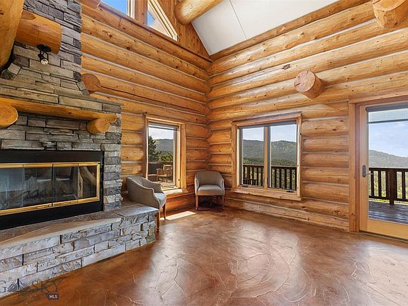 This custom log home is the Montana dream. The spectacular mountain views and the open pine forest make this home and 10 acres a private oasis. Let your stress melt away and enjoy the ultimate Montana living with close access to National Forest Land with abundant wildlife. The home features a large main level master suite, chef's kitchen with granite countertops, stainless appliances, and Wolf range. The great room has two story ceilings, stone fireplace, hand troweled concrete floors, and views out every window. The upper level is a large loft area with two open rooms with a walk out patio, and a full bathroom. The home also has high efficiency radiant in-floor heating, air conditioning in the master suite, custom tile work throughout, wood floors, wrap around porches, 2-car garage, landscaping with underground sprinklers, and many outdoor living areas. You get all this privacy, yet the home is less than 15 minutes from downtown Bozeman to enjoy dinning, shopping, and schools.