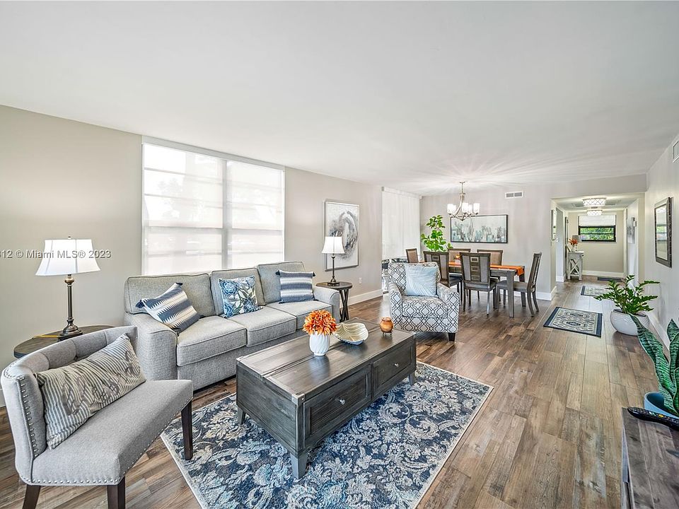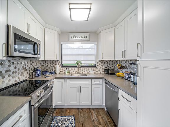 Light, bright, big & beautiful! Completely renovated corner unit in desirable guard gated community. Kitchen features almost new stainless steel appliances, quartz countertops, decorative backsplash, charming eat-in area, access to screened porch. New luxury vinyl plank flooring in living areas & designer tiles in bathrooms. Huge main suite has walk-in and wall closets, bathroom with double sinks, lots of storage. All light fixtures & blinds are upscale & almost new, with blackout blinds in main bedroom. Impact windows & doors plus hurricane shutters on patios. Stackable washer/Dryer. Assigned parking spot plus lots of nearby guest parking. Community features pool, exercise room, clubhouse, tennis, racquet ball. Near shopping, etc. 55+ Community. Assoc. requires 20% down payment.