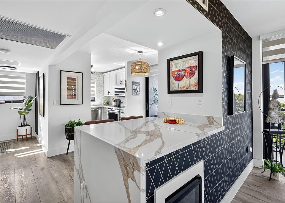 Stunning fully remodeled 2BR/2BA top-floor corner unit, 1,187 sq ft of open-concept living with panoramic garden and lake views, no neighbors above. Designer kitchen, quartz waterfall island, marble backsplash, white cabinetry, and stainless steel appliances. Interior features include luxury vinyl plank flooring throughout, impact windows and sliders, motorized shades, and custom built-in closet systems in both bedrooms. The spa-style primary suite offers barn doors, a dual vanity, mosaic tile finishes, and a spacious walk-in closet. Additional upgrades: New ventless LG washer/dryer, tankless water heater, whole-home water filtration system, and a 2025 A/C air handler and compressor. 2 oversized screened balconies with privacy roll-down shades, plus a same-floor oversized storage unit.
