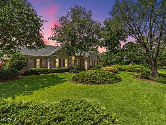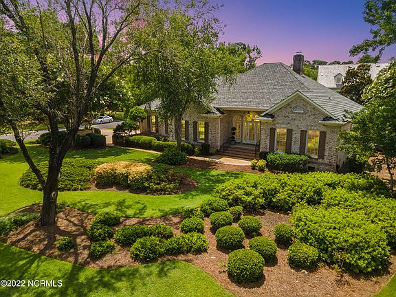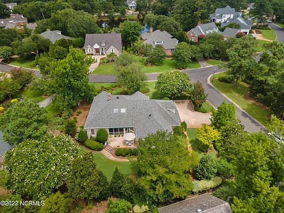 Located on the corner of a quiet cul-de-sac in Landfall is this custom 4 BR, 3 Bath, all-brick home, offering mostly one-level living and almost half an acre of beautiful lush landscaping. Built by Blanton Builders and for sale for the first time ever, the home stands the test of time with a semi-open floor plan and quality details throughout, that include hardwood flooring in the living areas, high ceilings, custom millwork and abundant crown molding. The rocking-chair covered front porch leads to an elegant foyer with soaring ceilings that is open to the light-filled living room featuring a beautiful brick hearth with a gas-log fireplace, a vaulted ceiling with skylights and patio door leading to a delightful screened porch. An expansive 17' x 20' kitchen features ample Kraftmaid cabinets, a desk area, breakfast bar, double ovens, dishwasher, electric range, refrigerator and microwave. The kitchen is open to the large breakfast room for casual dining and also the elegant formal dining room, which makes it ideal for entertaining. A first floor study is perfect as a home office or den. The primary bedroom suite on the first floor features a French door open to the outdoor terrace, a walk-in closet and an ensuite all-tiled bathroom with double vanities, a tiled shower, and bathtub. Two additional bedrooms, two full bathrooms and a laundry room complete the first floor. On the second level is a large bonus room or 4th bedroom with a lavish cedar closet and a fully floored walk-in attic with tremendous storage space. Enjoy outdoor living from the inviting screened porch and the open terrace with an automated awning for shade, making it perfect for al-fresco dining and lounging. The rear yard has a private setting, a beautiful lawn, mature specimen trees and could potentially accommodate a pool. Other features of this home include an irrigation well, hurricane shutters, a newer architectural shingle roof (2019), a sealed crawlspace with a