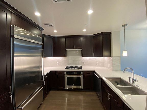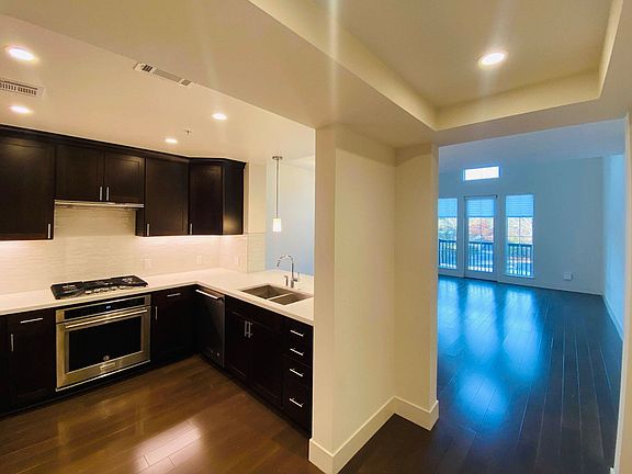 Stunning TOP FLOOR contemporary condo, located in DOWNTOWN Lafayette very close to great restaurants, shopping, freeway and BART. Engineered hardwood floors, open floor plan and soaring vaulted ceilings highlight this newer gorgeous unit. Beautiful kitchen featuring dark cabinets, stainless-steel full-size appliances, gas cooktop, quartz countertops, glass tiled backsplash and breakfast bar. Elegant dining area gives way to a natural light filled living room with oversized windows and soaring ceilings. Spacious bedroom with walk in closet, tiled floor bathroom, dual sink vanity and shower over tub. Attached water closet and additional sink create a half-bath experience for guests. Washer and dryer in unit. The facility features interior common area, outdoor lounge area, bike storage, EV battery stations and secured parking garage with one space included in rent. No Smoking. One SMALL pet negotiable with owner approval and additional deposit. Water, Garbage, and HOA included in rent. Please note: There is an additional building move- in service fee of $350 weekdays and $400 on the weekends.