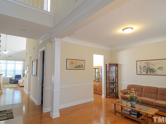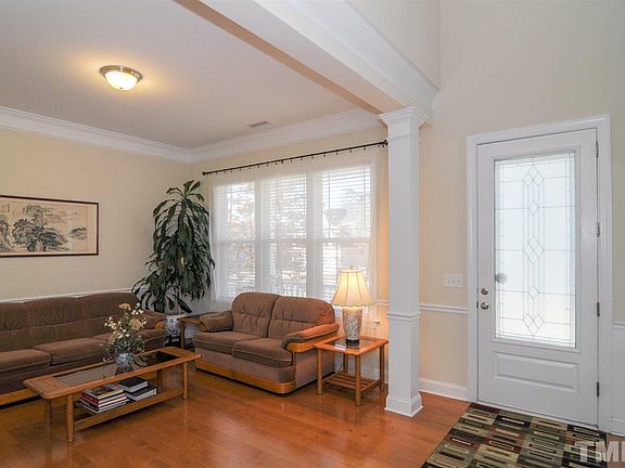 This stunning home is better than new, Bright and Open Floorplan and is move in ready. Features Luxurious 1st floor Master Suite with 3 additional bdrms, bonus rm and 2 full baths upstairs. Owner's suite includes soaking tub separate shower as well as a huge w/in closet. Desirable location 20min to RTP, RDU, close to schools, new Costco downtown 64 and 540. Gleaming hardwoods on main level, bths and lndry with tiled flrs. Gourmet kitchen, large 2 story living room. HOA dues cover complete yard maintenance