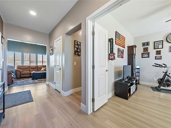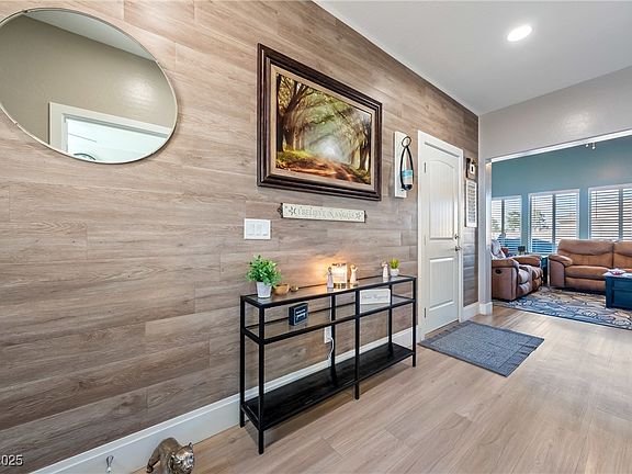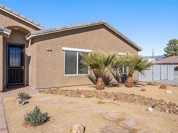 Experience modern elegance in this meticulously maintained 1683 SF home in the heart of Pahrump. Built in 2019 on a desirable corner lot near Pahrump's shopping areas, this residence features 4 bedrooms and 2 beautiful bathrooms. The main area boasts wood-look luxury vinyl floors, while cozy carpet accents the bedrooms. An open floor plan seamlessly connects the kitchen, dining, and living areas, enhanced by quartz countertops, stainless appliances and soft-close cabinets. A beautiful front entry foyer welcomes you home. The 2-car garage equipped with recessed lighting and ample storage space opens onto the front foyer as well. Additional highlights include a water softener and low-maintenance desert landscaping surrounded by a fully fenced backyard with RV gate. True pride of ownership shows in this lovely home!