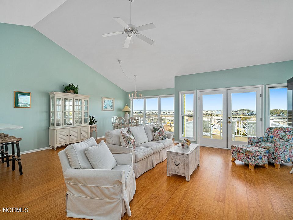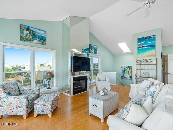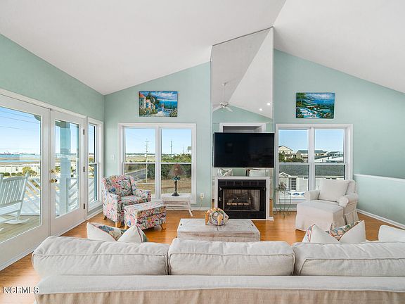 Panoramic views of Bogue Sound in this oceanside beauty! The home boasts 2 bedrooms, 2.5 bathrooms, flex/bonus room with closet and window, an immaculate garage for storing beach and fishing gear, vaulted ceilings on the top floor and plenty of space to spread out! Just a 5-minute stroll to the ocean makes beach days easy and convenient. Indulge in outdoor living with sound-side decks on the second and third floors, perfect for savoring the picturesque surroundings. At the entrance, a covered patio adds a touch of charm. Sunlight floods every corner, creating a warm and inviting space along with beautiful third floor furnishings being offered with the property. This coastal haven is conveniently located in highly desirable Atlantic Beach and with a quick drive to the vibrant attractions of Morehead City and Beaufort.