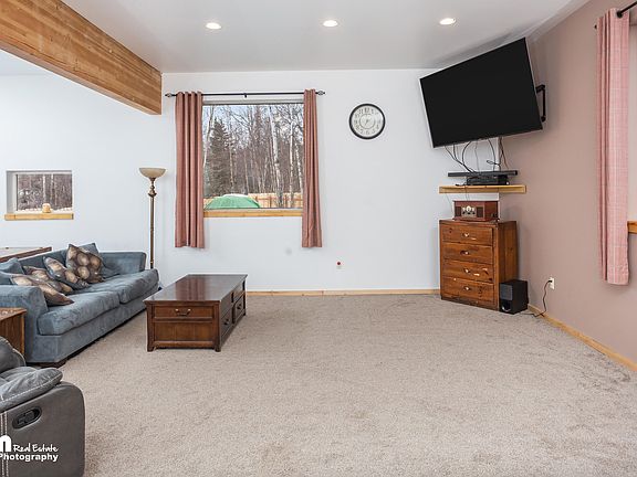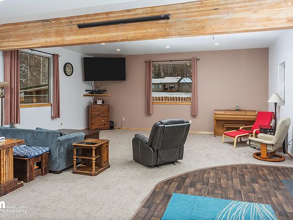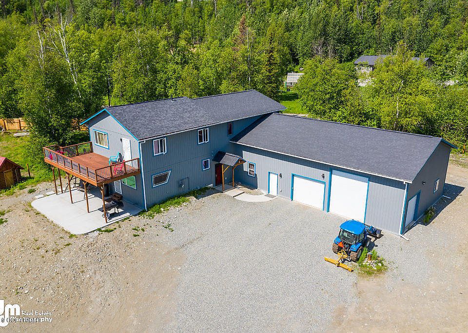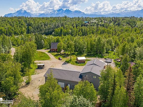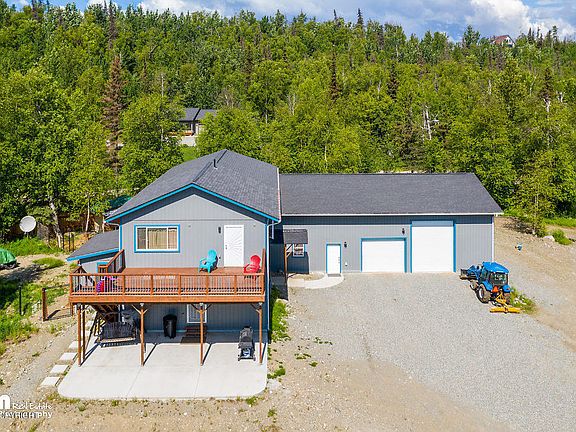 Custom home w/1680 sf HUGE Garage/Shop situated on 1.89 acres! Everything about this home is OVERSIZED! From the grand family room w/soaring 11.5 ft ceilings & custom built-in shelving w/storage to the dedicated office and spacious dining area! Large decks offer beautiful Views while overlooking the basketball court! Garage features an indoor workout space & TONS of room for all your Alaskan toys!