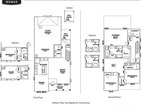 The Riviera is spacious living in a smart layout. With up to four bedrooms, including the luxurious owner's suite with private bath and large walk-in closet, this floorplan has everything you need for comfortable, convenient living. The spacious, open-concept living area features a large great room, dining area, and kitchen leading to a covered patio. Choose an optional study for a quiet space to relax. An upstairs loft adds more living space for the whole family. A dedicated laundry area, covered stoop, and storage complete this design.