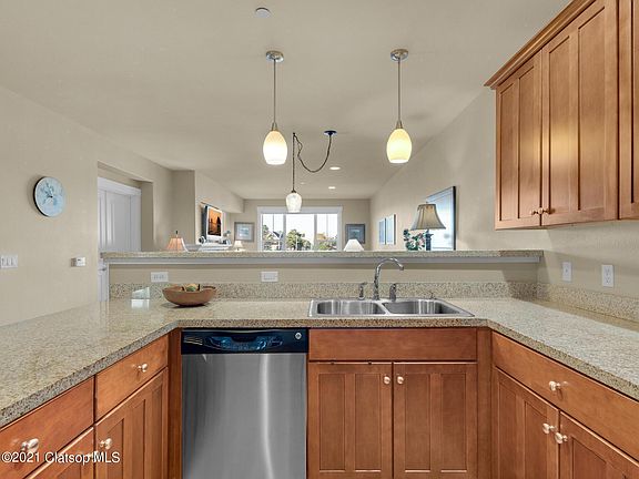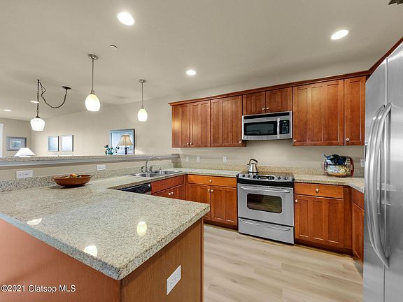 Riverfront retreat in Seaside's desirable Bridgeport community! Rare end-unit location means more natural light from additional windows and unobstructed river and Tillamook Head views! This inviting, turnkey condo boasts warm wood cabinetry, granite counters, SS appliance package, gas fireplace & a spacious primary bedroom en-suite deck access & river view. The unit includes a storage unit, carport, plus an additional uncovered parking space. Community perks include: gated parking, elevator, community room & exercise room. All within a short distance of the ocean, Prom & downtown Seaside.