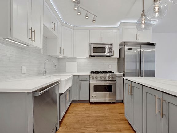 Farmhouse sinkSpacious king size bedroomElegant quartz countertopsStunning newly renovated kitchenRooftop sundeckViking appliancesCrisp white cabinetry