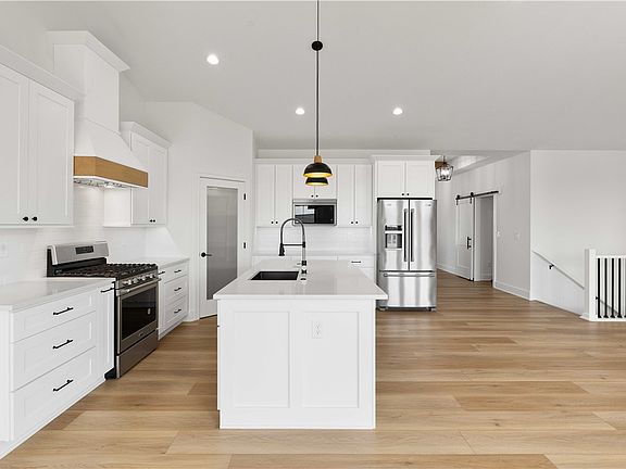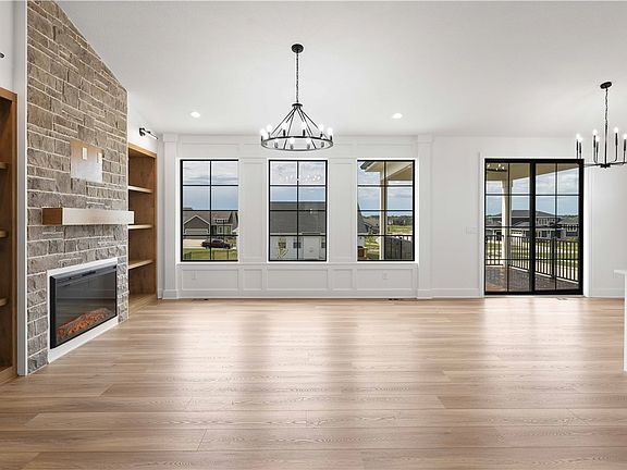 This exquisite Walkout Modern Ranch Farmhouse has 2,887 Sq Ft of beautiful finished living space. Genuine Homes has done it Again! As you enter you're greeted with a large entryway that leads to an open concept family room featuring a vaulted ceiling, a stone electric fireplace, custom wood floating shelves & decorative stained ceiling beams. The kitchen has quartz countertops, pantry, soft close cabinets, underneath cabinet lighting, tile backsplash, composite sink and Maytag Stainless Steel appliances including a refrigerator. Off the dining area are 8' patio doors that open to a large 12' x14' composite & covered deck perfect for relaxing in the evening. Main level includes an owner suite with decorative tray ceiling, wall design, along with an ensuite bathroom and walk-in closet w/custom wood shelving. There are 2 additional bedrooms, bathroom and laundry room with barn-door, built-in shelving and mudroom right off the garage. Lower level features 9' ceilings, wet bar area with Maytag refrigerator, electric stone fireplace w/wood mantle & floating shelves, two additional bedrooms plus a full bathroom, and a huge storage area. Other features include a 3-Car attached garage, dual temperature control, professional landscaping, lawn irrigation, HUGE cement patio, radon mitigation, extra rebar, 2x6 construction and so much more. Located near the new Grimes Heritage Park development. This home won't be on the market long! All information obtained from seller and public records.