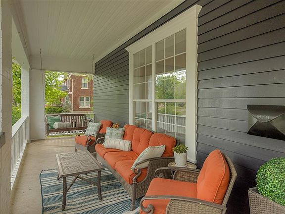 A full-width front porch looks out over the original trolley line that once carried Oklahomans home from the city, offering a unique link to local history. The backyard provides a peaceful outdoor setting with a flagstone patio, water feature, mature shade trees, and thoughtfully planned landscaping.