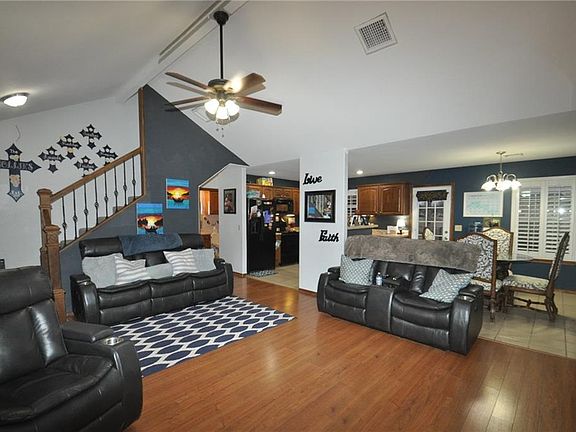 Come check out this remodeled home in Moore. IT HAS 4 TRUE BEDROOMS! As you enter the front door, you will be pleasantly surprised w/ the open floor plan, modern colors, and many updates throughout. Large living room w/ a beautiful wood-burning fireplace, plantation shutters, & laminate wood floors. It opens to the kitchen & the dining room. A perfect place to entertain. The kitchen has plenty of cabinets, counterspace, a breakfast bar, & pantry. The master suite is large w/ a single vanity, walk-in closet, and tub/shower combo. The 2nd and 3rd bedrooms are spacious - both with ceilings fans. The 4th bedroom is upstairs. Take the entertainment outside with a covered patio, great outdoor kitchen w/ grill & cooler, above-ground swimming pool w/ a resin deck, and an outdoor storm shelter. And hey, if a swimming pool is not your thing....we can remove it. Other updates include roof w/ class-4 shingles, full gutters, extended driveway w/ basketball goal & 13mo HWA home warranty.