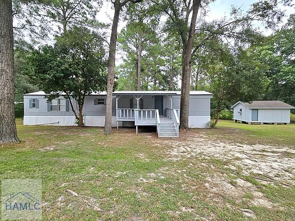 Over 2 acres with an updated 2 bedroom, 2 bath home and 2 outbuildings. The home has updated lighting fixtures, fresh paint, new flooring, new metal roof, and new spacious front deck and new back deck. The kitchen has: new cabinets, new tile countertops and backsplash. Both bathrooms have new vanities and updated showers. The master bedroom is spacious and the master suite bath has a tiled shower surround. Both outbuildings are wired for power - 1 is a storage building and the other is a hobby shop or workshop. Amazing, Wooded backyard view and lots of room to play! Location is convenient to Pembroke, Hinesville, Pooler & Statesboro.