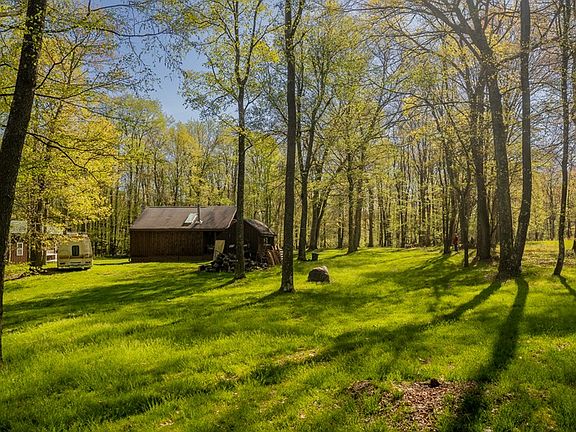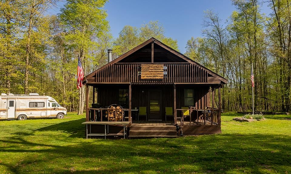 Cabin located back a private lane on 20 mostly wooded acres, 1 Bedroom, 1 Bath, with spring water and on site septic. Cabin has a wood stove and a mini split heating and cooling system. Large pole building with 2 overhead garage doors, large shed, and a fire ring. Large level yard. Property is being sold furnished. Located within walking distance to Sandy Creek (stocked trout stream) and 1 mile to State Game Lands 130 with 2,000 Acres.