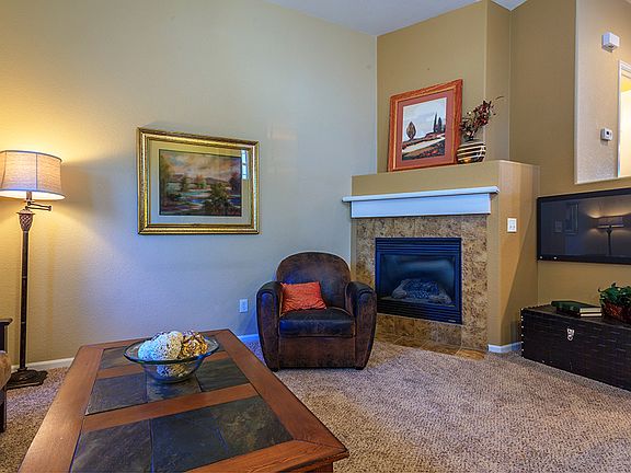 Contemporary two bedroom, three bathroom end unit in the Brownstones at Town Center. High quality upgrades throughout. Spectacular vaulted entry and living room with a gas fireplace and new carpet. Open and upgraded the kitchen features hardwood floors, slab granite countertops, cherry cabinets, a center island and stainless steel appliances. The adjoining room also maintains hardwood floors and provides access to the spacious covered balcony with mountain views. Upstairs encompasses dual master bedrooms with walk-in closets and attached updated bathrooms. Close to Civic Green Park, many pocket parks, trails, dining, shopping and more. This is a standout condo in a fantastic community and will not last!